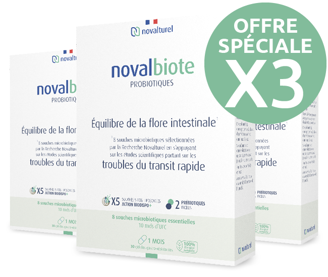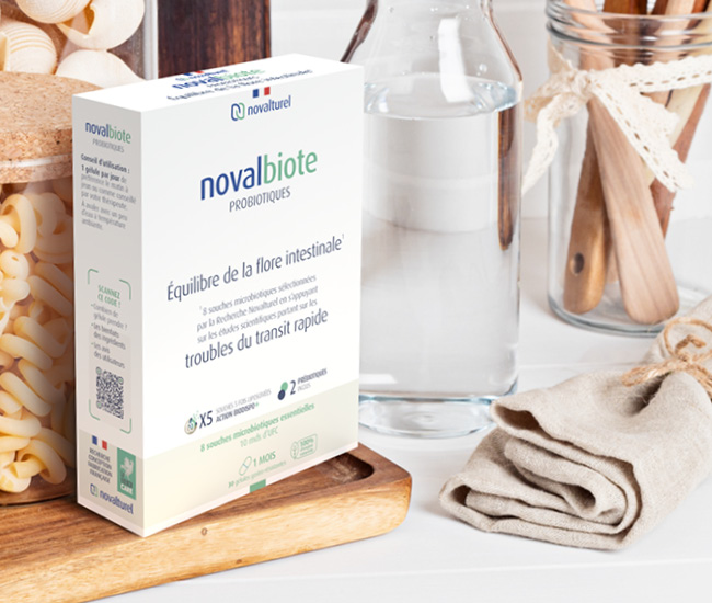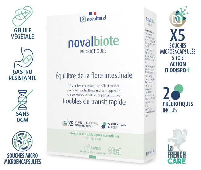 Novalbiote est une association équilibrée scientifiquement de 8 probiotiques (souches microbiotiques) considérées par nos médecins nutritionnistes comme essentiels. Ils vont restaurer ou maintenir un bon équilibre de la flore intestinale (microbiote), réguler le transit et les troubles digestifs (ballonnements, diarrhées, constipation…).