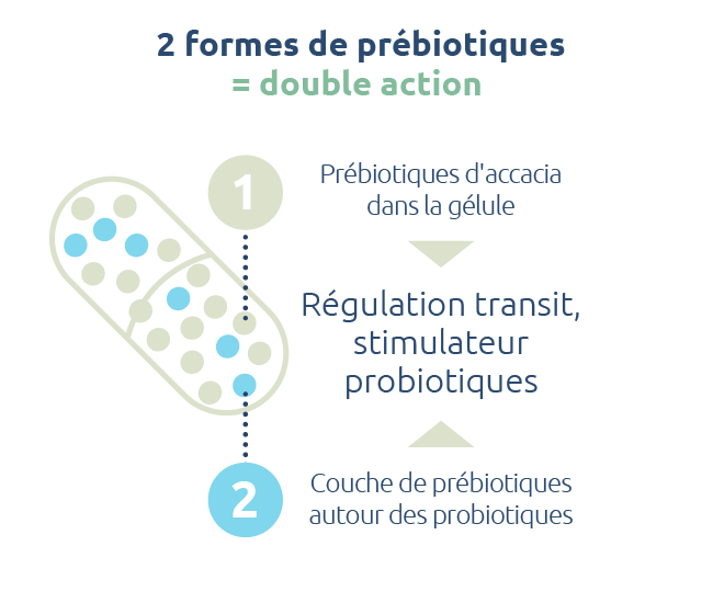 Novalbiote contient un prébiotique, ingrédient qui va apporter des fibres à l’organisme. Ces fibres d’acacia sont des polysaccharides qui vont traverser le système digestif sans être assimilées. Elles augmentent la survie des bactéries bénéfiques et favorisent la croissance de ces dernières mais aussi stimulent leur activité biologique. Les prébiotiques vont donc servir « d’aliments » aux souches microbiotiques. Le microbiote bénéficie d’une action « symbiotique » par l’association entre les 8 probiotiques (souches microbiotiques) et le prébiotique d’acacia.