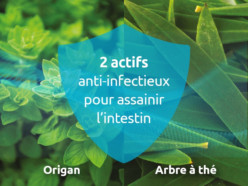 2 huiles essentielles BIO origan et arbre à thé (Tea tree) microencapsulées, pour purifier l’intestin1.
