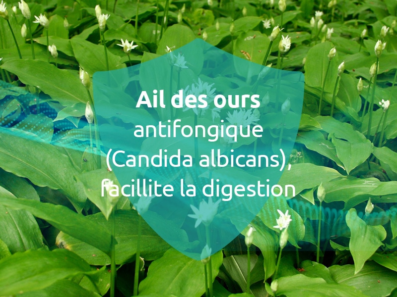 L’ail des ours (Allium ursinum L.) contient des principes actifs comparables à ceux de l’ail commun mais en plus concentrés. Il est très riche en vitamine C, sulfure de vinyle, sels et surtout en allicine (interaction entre alliine et alliinase), un antimicrobien très puissant. L’allicine empêche la formation de mycotoxine comme les Candida albicans, levures ou champignons microscopiques et combat la candidose. Ce principe actif est efficace pour les problèmes intestinaux comme les maux d’estomac et les ballonnements. Il facilite la digestion et il est utile pour apaiser les gastrites. C’est un actif traditionnel pour réagir contre le ver nématode (ascaride), parasite intestinal qui provoque l’ascaridiose.